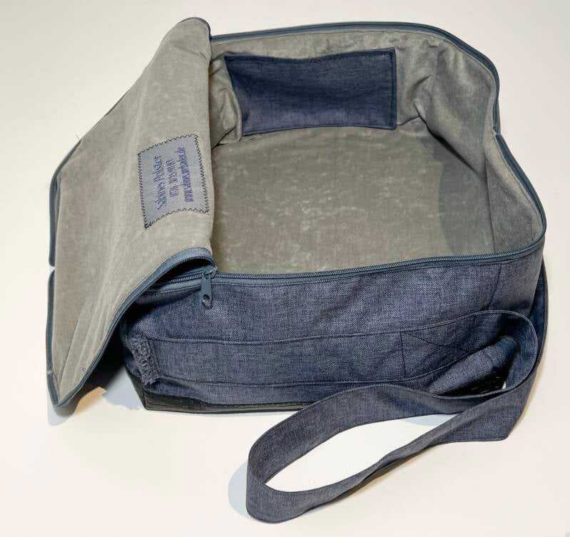Zum Verstauen wird die Tasche zunächst mit der schmalen Seite unter den Sitz geschoben und anschließend so gedreht, dass die breite Seite nach unten zeigt. Die Tasche hat die Maße von ca. 40 × 30 × 15 cm (B × T × H) und bietet damit rund 18 Liter Fassungsvermögen bei einem Eigengewicht von nur etwa 450 g.